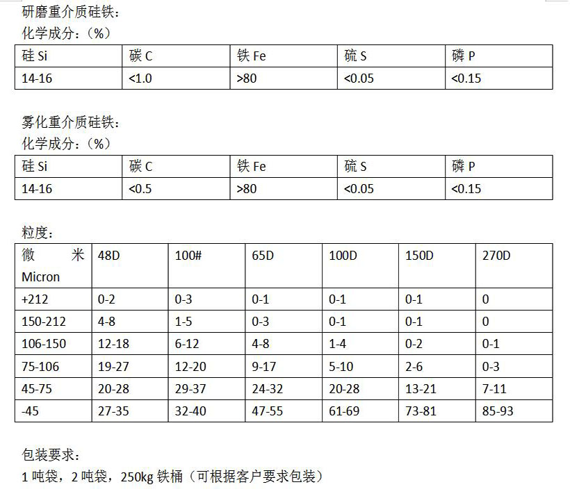 实际生产中应用较多的还是是安徽重介质硅铁,这是一种专门冶炼成的硅安徽铁合金,具有耐氧化,硬度大,带强磁性等特点。使用后经过筛分和磁选回收,可以返回再用。硅铁中含硅小于13%时,韧性增加,给磨碎制备带来困难,而且在水中易于氧化,当含硅超过18%时,磁性减弱不便回收。故以含硅13%-18%,含铁87%-82%的硅铁较适合使用。