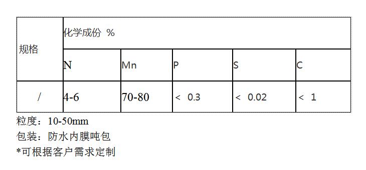 安徽氮化锰铁采用中碳锰铁、电解金属锰、氮气制得安徽氮化锰铁(氮化金属锰)。安徽氮化锰铁是优良的炼钢添加剂,能提高钢的强度等机械性能,细化晶粒,稳定奥氏体,在高强度低合金钢的冶炼中广泛应用。氮化金属锰作为氮和锰的合金添加剂,主要用于生产高强度钢、不锈钢、耐热钢等产品。